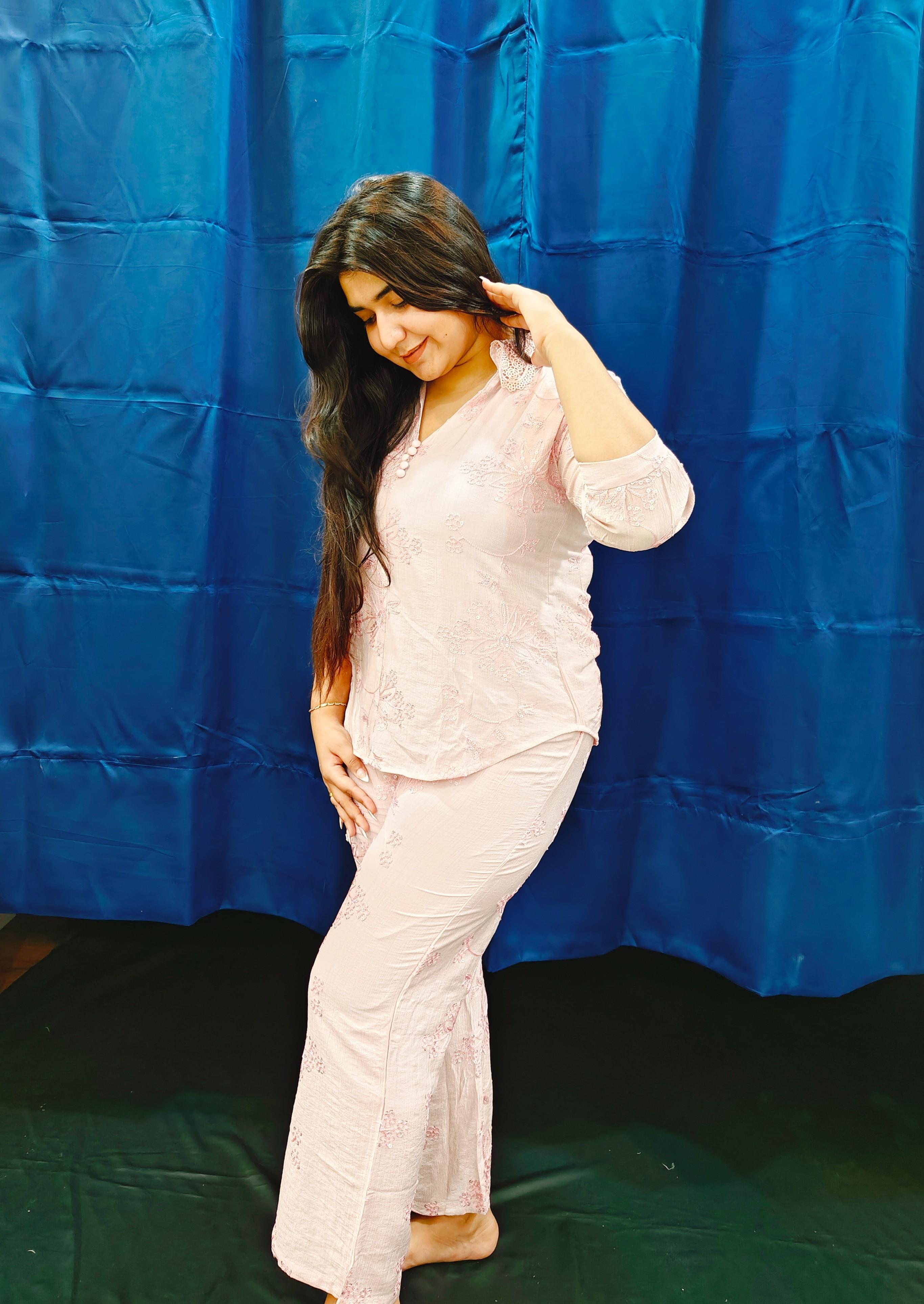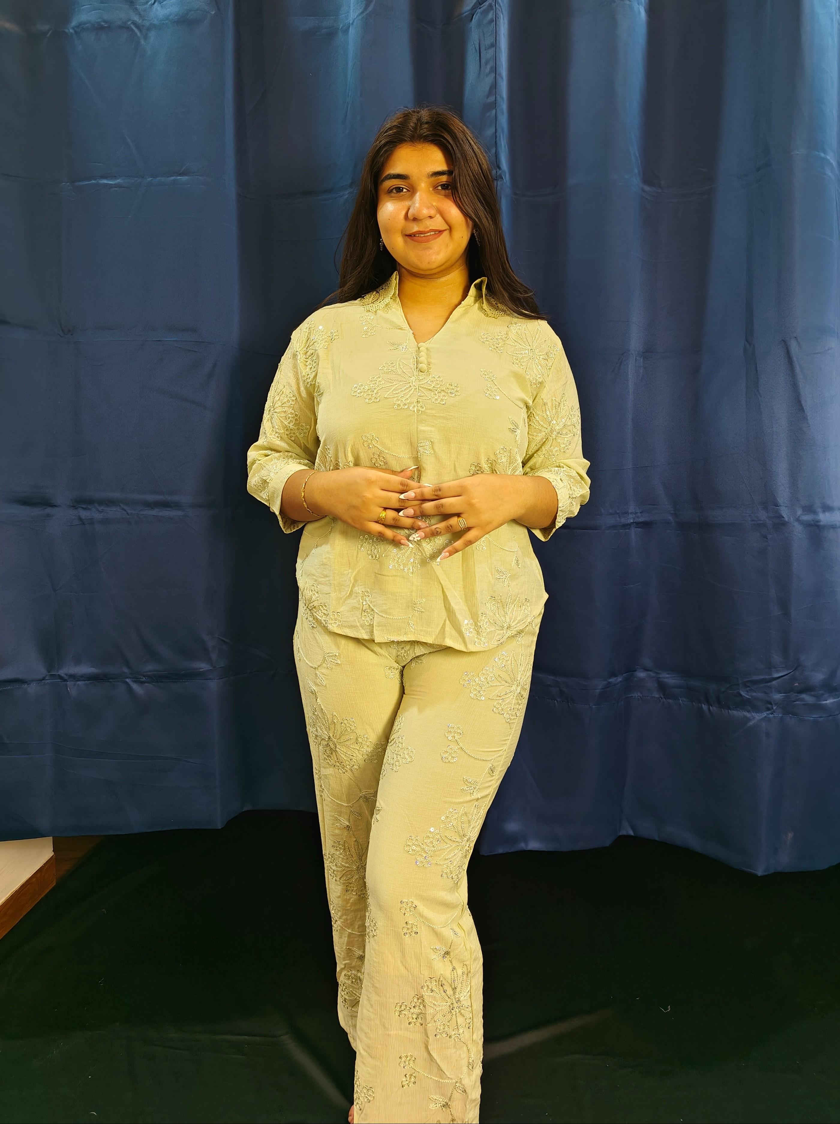 Shirt styled top with straight pants